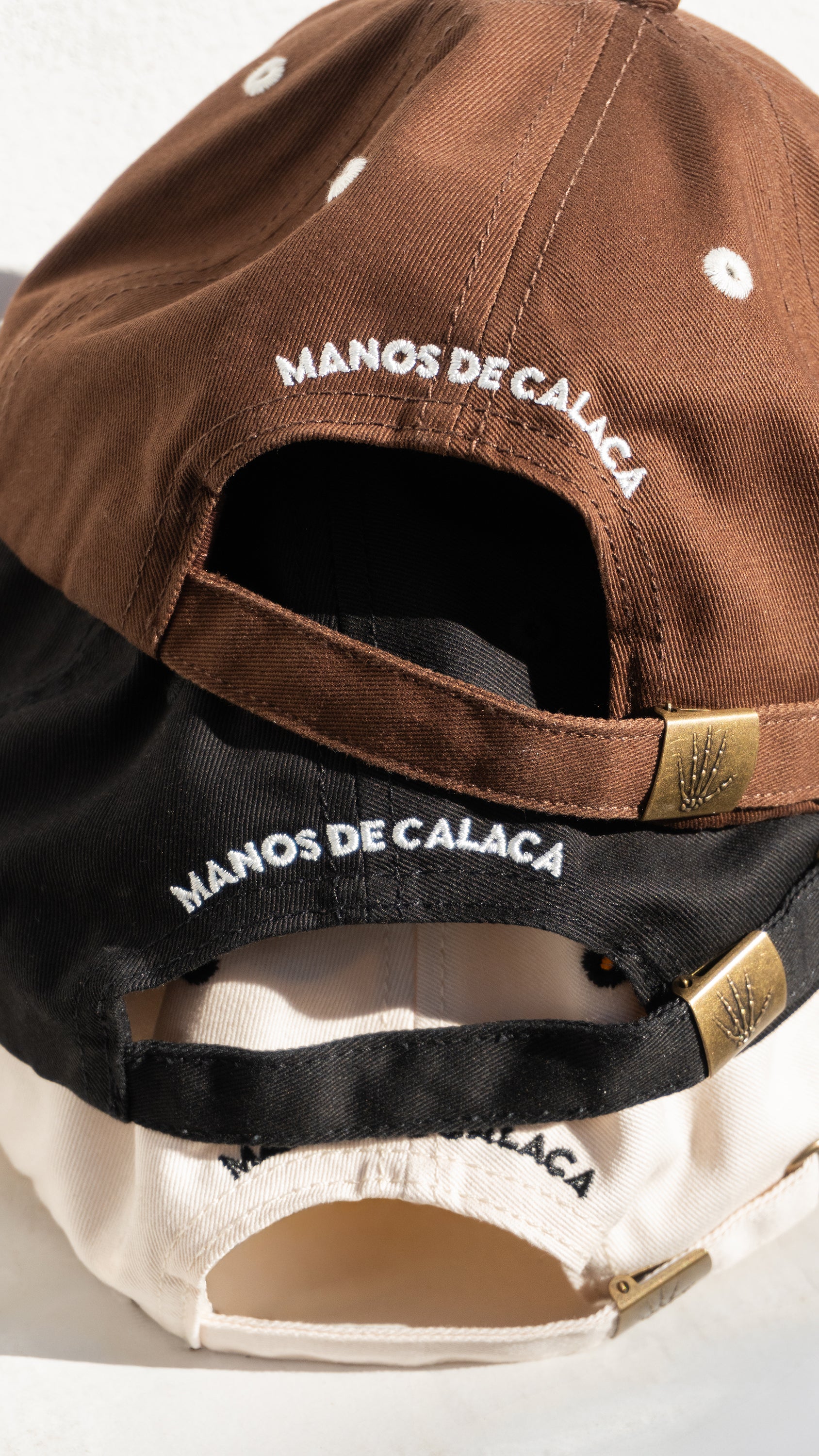 Gorra café con parche frontal tipo mecánico con bordado de alta calidad. Incluye detalle posterior con el logo curveado de Manos de Calaca, además de la icónica mano en el lateral y en la hebilla de ajuste.